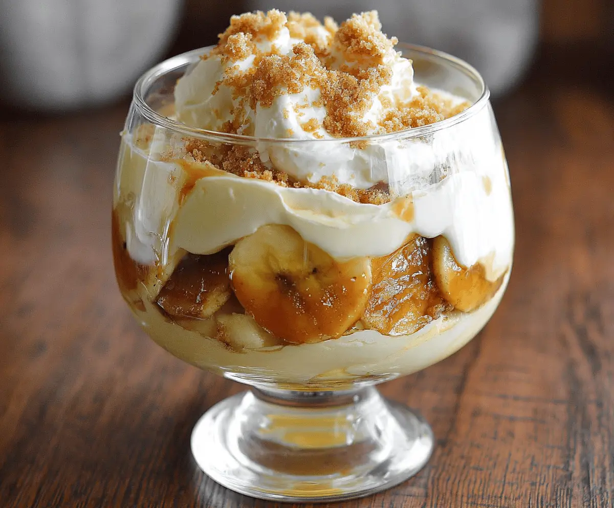 Arrange a few caramelized banana slices on top of the whipped cream. Drizzle with caramel sauce and sprinkle lightly with extra cinnamon for a beautiful finish. Cover and refrigerate for at least 2 hours before serving. Serve chilled and enjoy every spoonful of this creamy, caramel-kissed dessert.