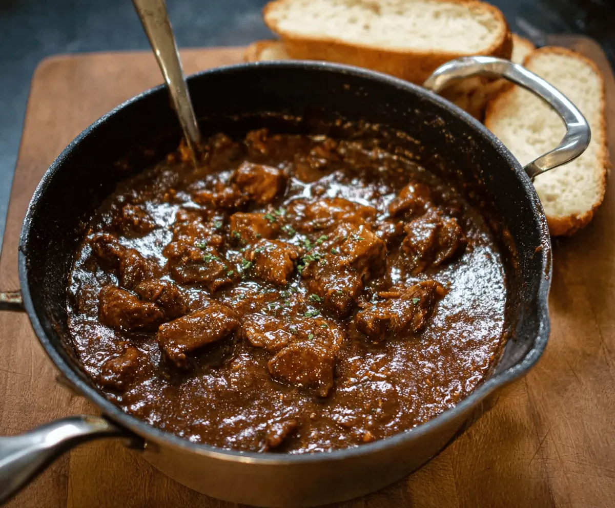 Once cooked, taste and adjust seasoning with salt, pepper, or a splash more vinegar if needed. Optionally, stir in 2 tablespoons of butter for a smooth, glossy sauce. Remove bay leaves and thyme sprigs. Garnish with fresh thyme or parsley. Serve hot with creamy mashed potatoes or crusty bread to soak up the delicious sauce.