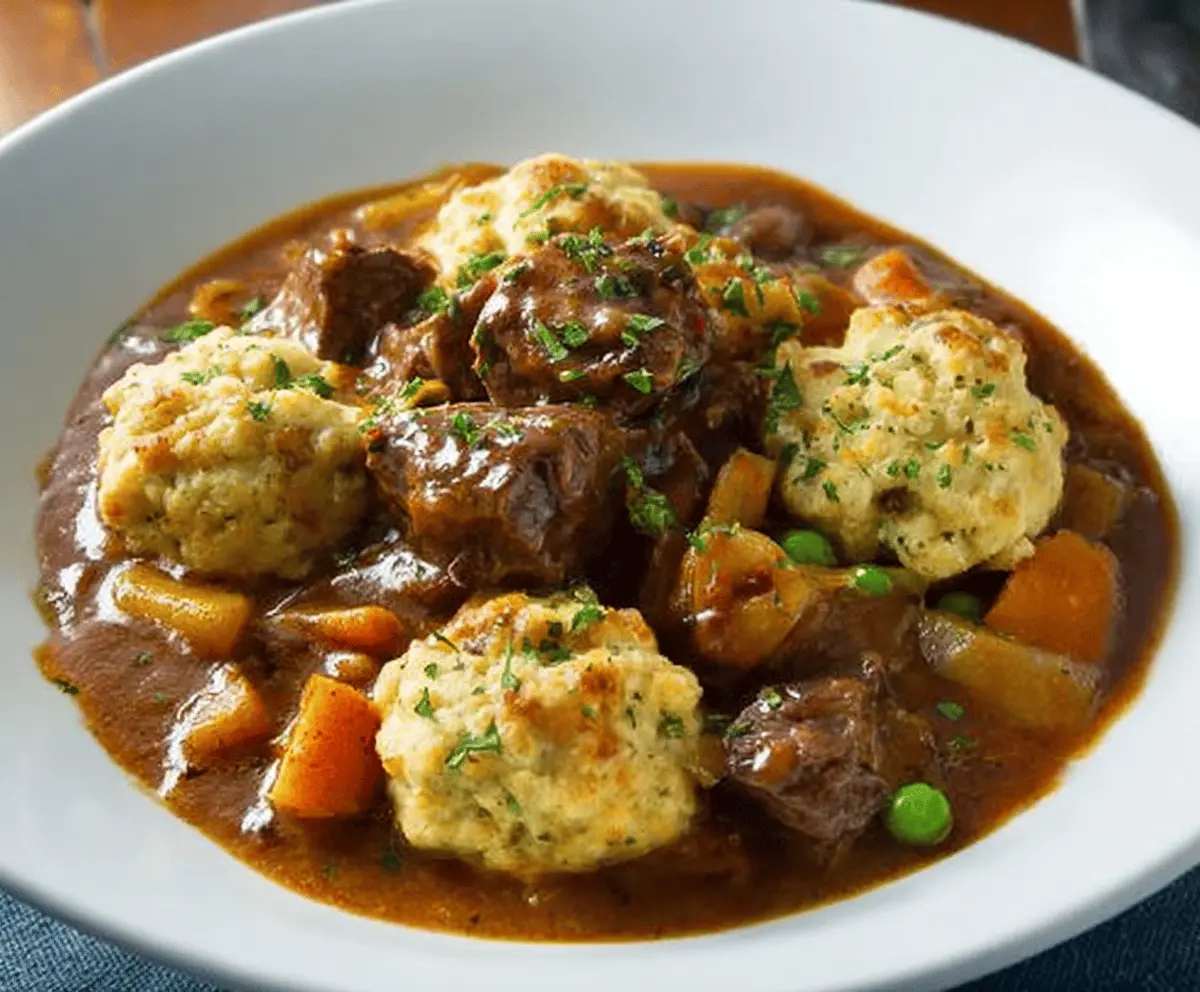 Beef Stew with Dumplings is a heartwarming dish that brings together tender chunks of beef simmered slowly with carrots, potatoes, and rich broth. The fluffy dumplings on top soak up all the delicious juices, making every bite comforting and filling. It’s like a warm hug on a plate, perfect for chilly days when you want something cozy and satisfying.