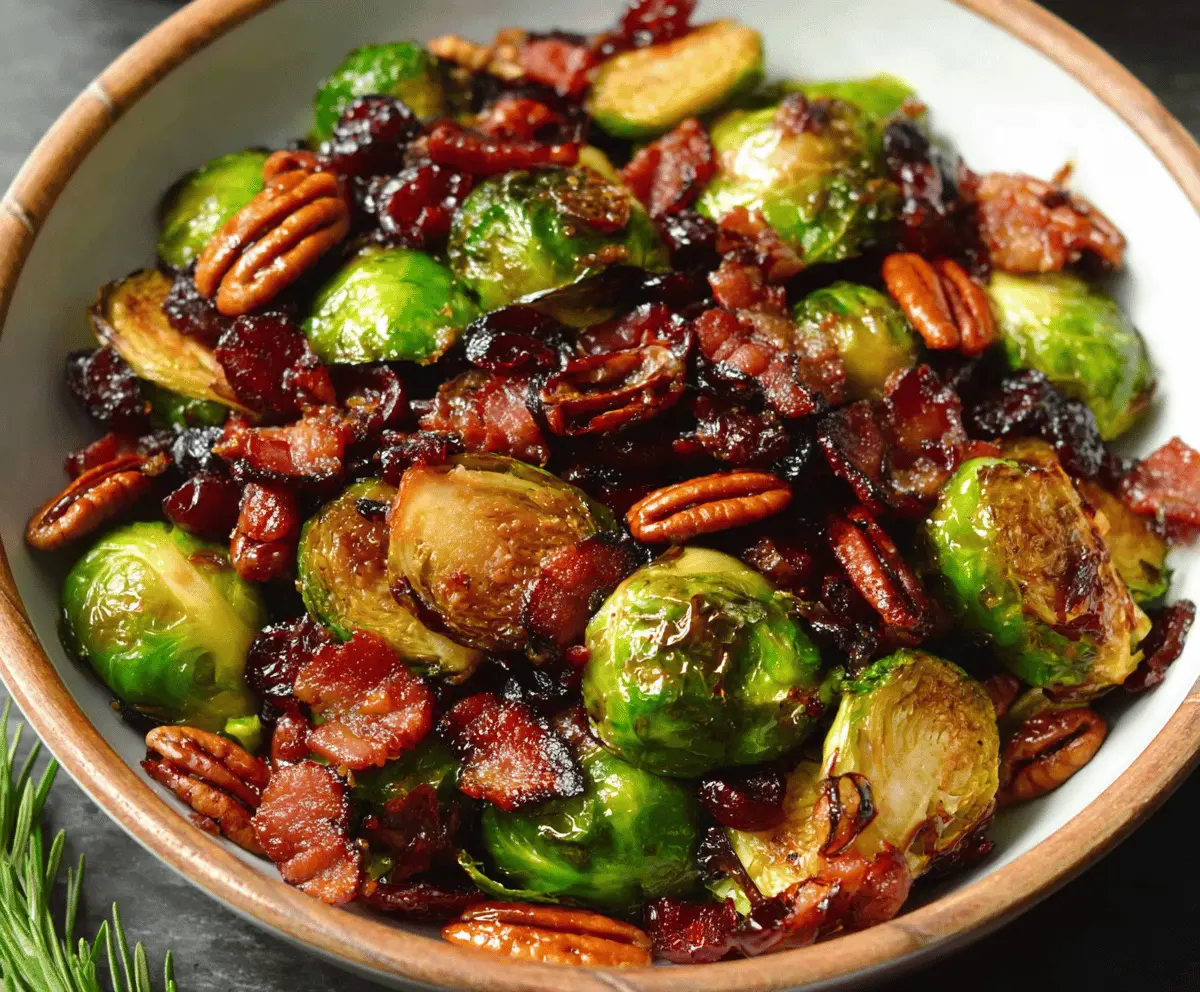 Brussels Sprouts with Bacon, Pecans, Cranberries, and Balsamic Glaze