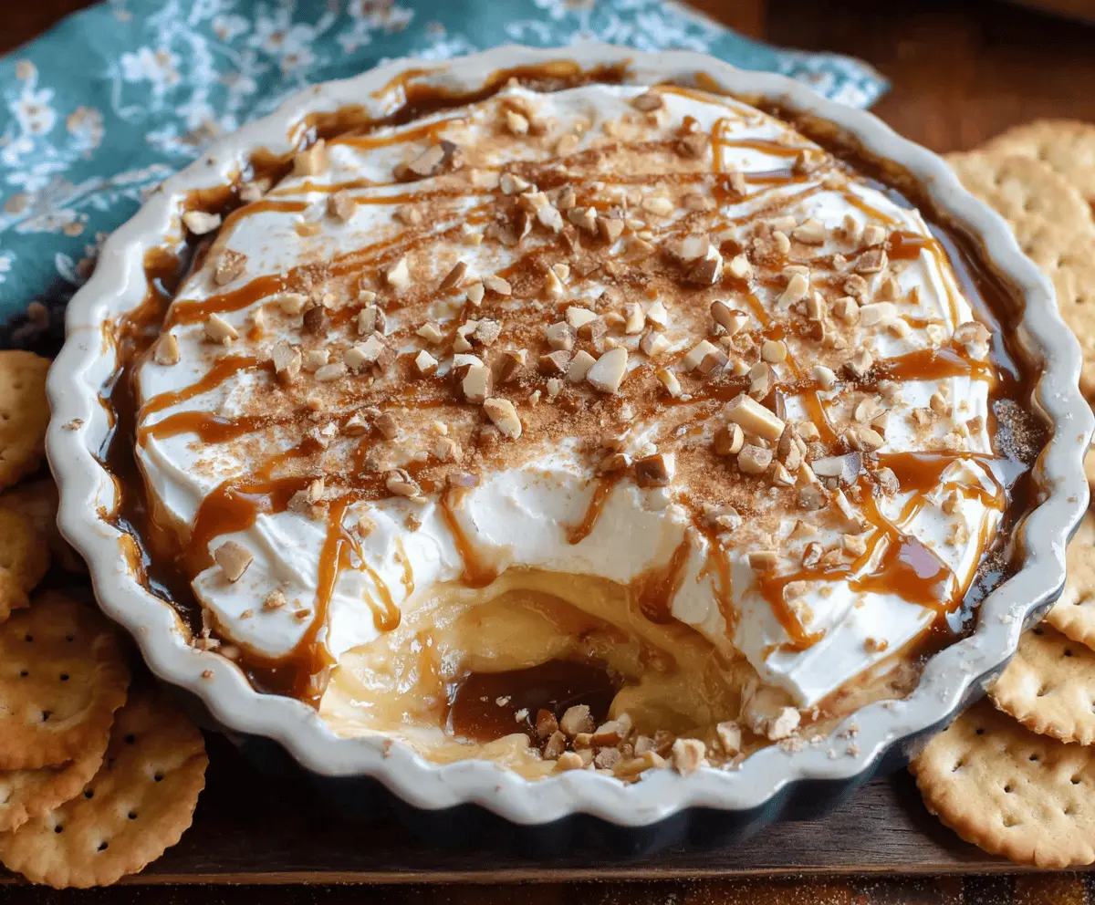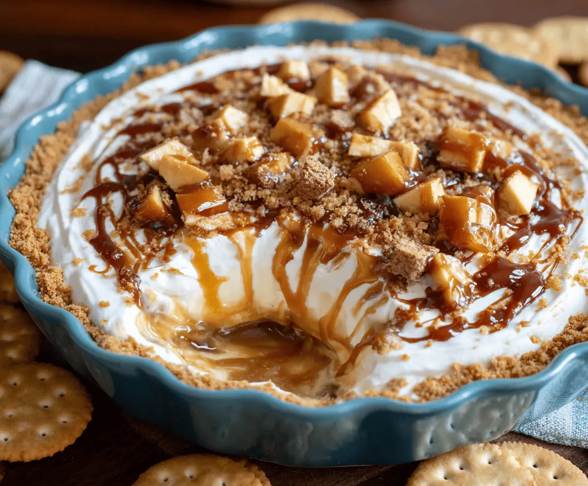 Creamy caramel apple cheesecake dip topped with caramel sauce and apple slices, perfect for fall desserts and party snacks.