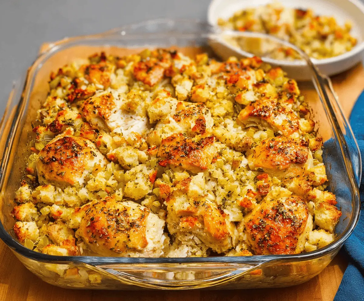 Chicken and Stuffing Bake is a cozy, one-pan meal that’s packed with comforting flavors. Tender chicken pieces are nestled right on top of a fluffy, savory stuffing that soaks up all the delicious juices as it bakes. It’s simple, hearty, and perfect for a no-fuss dinner that still feels special.