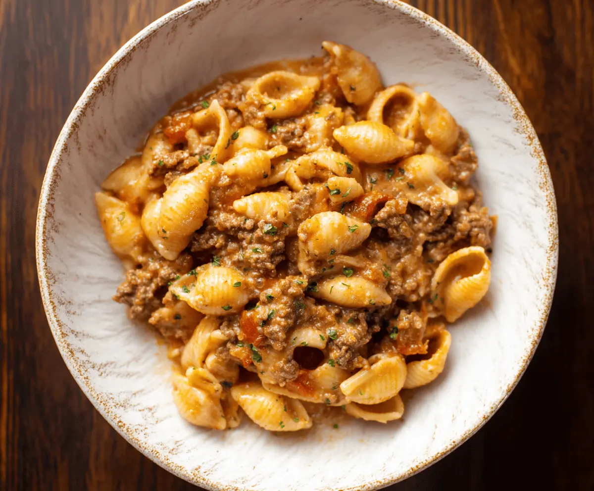 Add the cooked pasta shells to the skillet and toss gently so every shell gets coated in that rich, creamy beef sauce. Taste the dish and adjust the seasoning with more salt or pepper if needed. Serve it hot, sprinkled with fresh chopped parsley and extra Parmesan if you like.