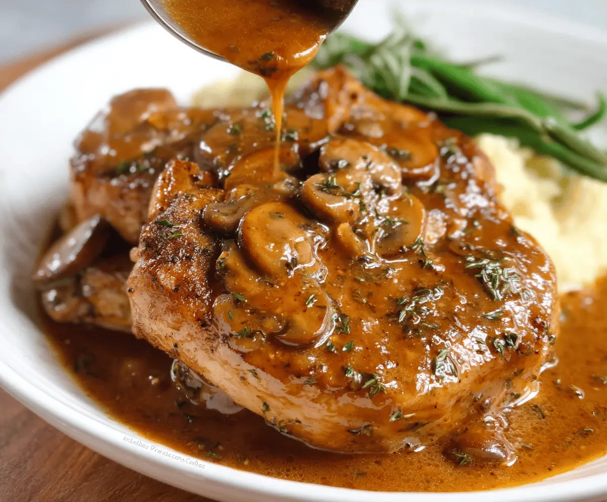 Place your pork chops onto plates and spoon the delicious gravy on top. These pork chops go beautifully with creamy mashed potatoes and steamed green beans, making a warm, comforting meal.