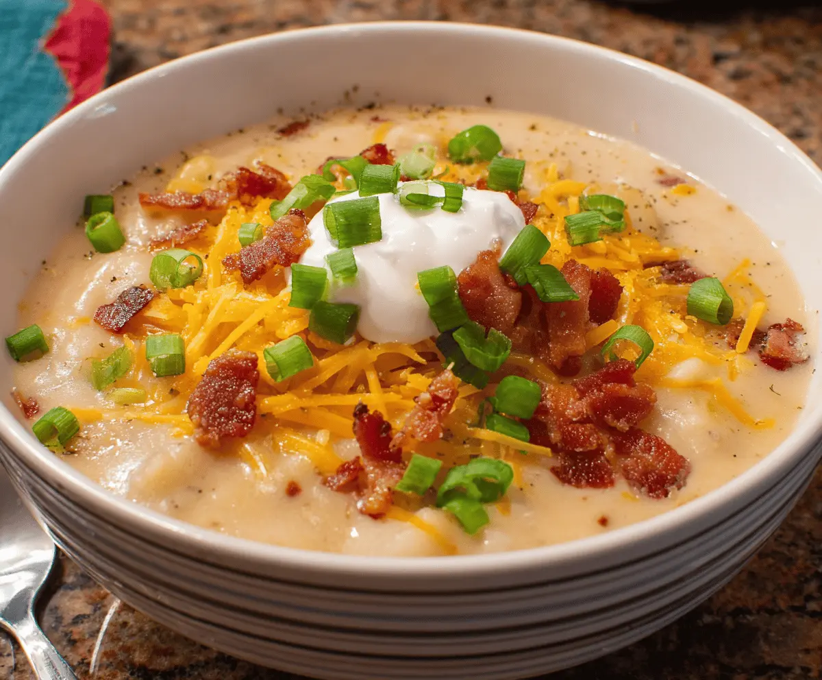 Spoon the soup into bowls. Top each serving with the crumbled bacon you saved, the remaining shredded cheddar cheese, a dollop of sour cream if you like, and the sliced green onions. Enjoy it warm, maybe with some crusty bread or crackers on the side!