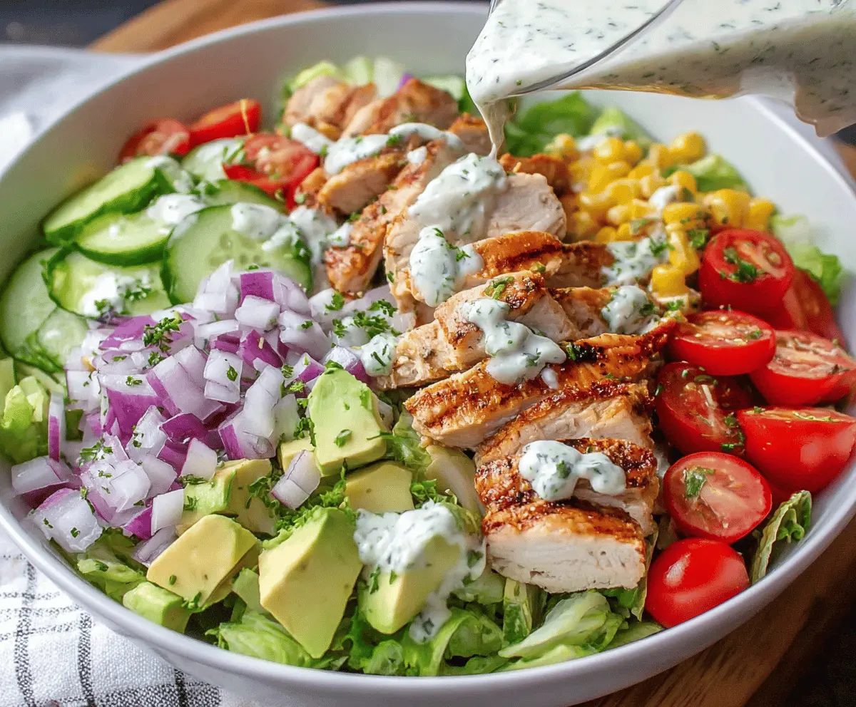 In a large salad bowl, lay down the chopped romaine lettuce. Arrange the sliced chicken on top, then add the halved cherry tomatoes, sliced cucumber, chopped red onion, corn kernels, and diced avocado.