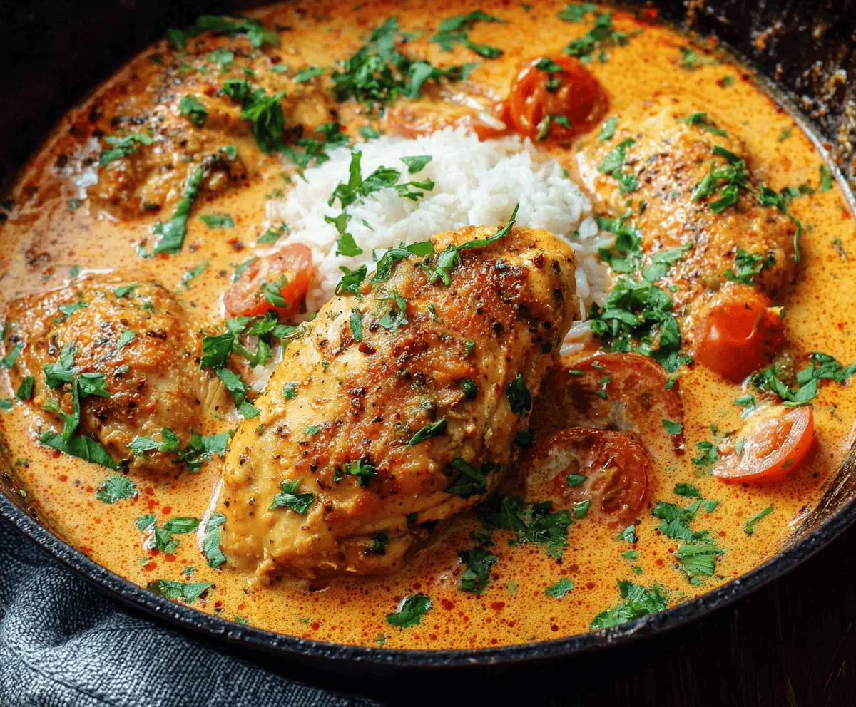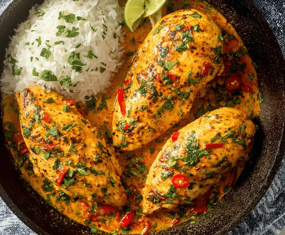 Plate the chicken and spoon the creamy coconut sauce over it. Serve hot alongside cooked white rice, and garnish with extra chopped cilantro and lime wedges if you like.